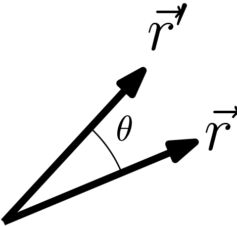 To understand the meaning of this, it is helpful to recall the geometric interpretation of the inner product (dot product) in $\mathbb{R}^2$. If we have two vectors $\vec{r}$ and $\vec{r}'$ then $\vec{r}\cdot \vec{r}' = ||\vec{r}|| ||\vec{r}'|| \cos \theta$, where $||\vec{r}||$ and $||\vec{r}'||$ are the lengths of the vectors $\vec{r}$ and $\vec{r}'$, and $\theta$ is the angle between them. This is illustrated below.