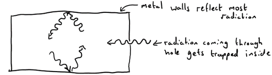 A blackbody is an idealized object that absorbs all of the radiation that hits it (none is reflected so it looks black in ordinary lighting).