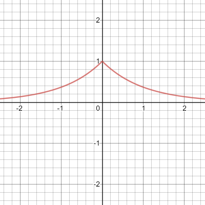 Consider the harmonic oscillator Hamiltonian \[\hat{H} = \frac{\hat{p}^2}{2m} + \frac{1}{2}m\omega^2 x\] and suppose that our ansatz for the ground state is $\psi(x) = Ae^{-b|x|}$. This is plotted below for the case $b=1$.