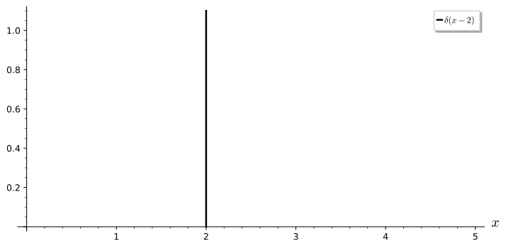 Similarly, if we want to describe a particle with a well-defined position $x = x_0$, we would use $\psi(x,t) = \delta(x-x_0)$, where $\delta(x - x_0)$ is a Dirac delta function. These will be defined more rigorously in the next module, but for now you can think of it as a “function” that is zero everywhere except at $x=x_0$, where it suddenly jumps to infinity. The Dirac delta function $\delta(x-2)$ is illustrated below.
