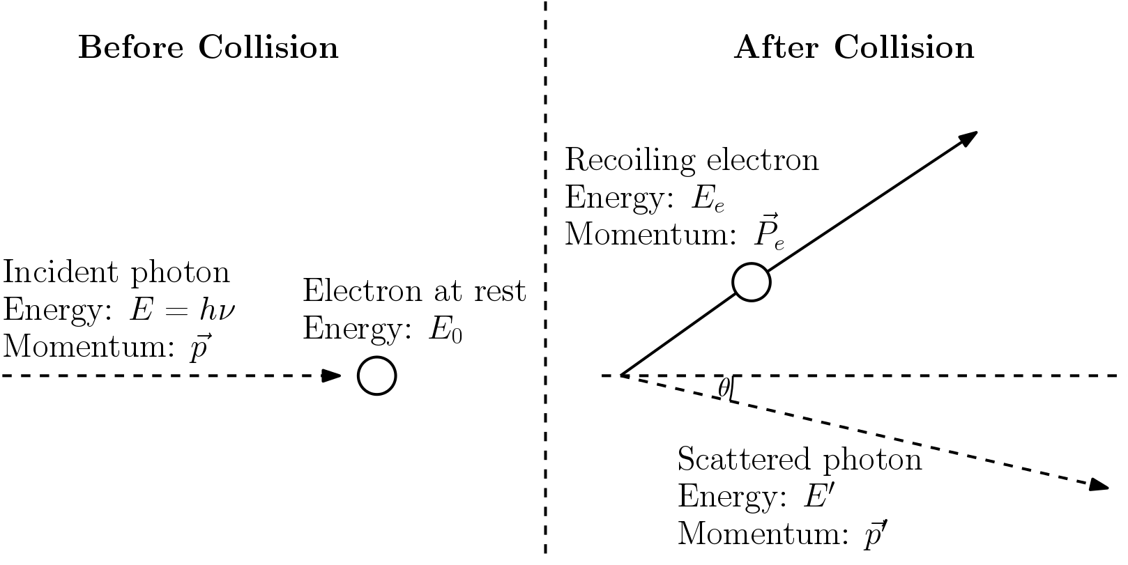 Compton was able to explain this effect by assuming that X-rays consist of a stream of particles (photons) of energy $E=h\nu$ that scatter elastically off the electrons. Using conservation of momentum and energy, together with the quantum postulate, we can derive the wavelength and angle of the scattered photons. The setup is illustrated in the following figure.